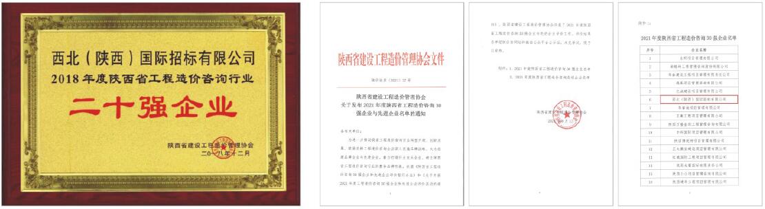 2010年至今,連續(xù)入選“陜西省工程造價企業(yè)二十強”及“陜西省工程造價行業(yè)三十強”,2014年后連續(xù)入選前十強。