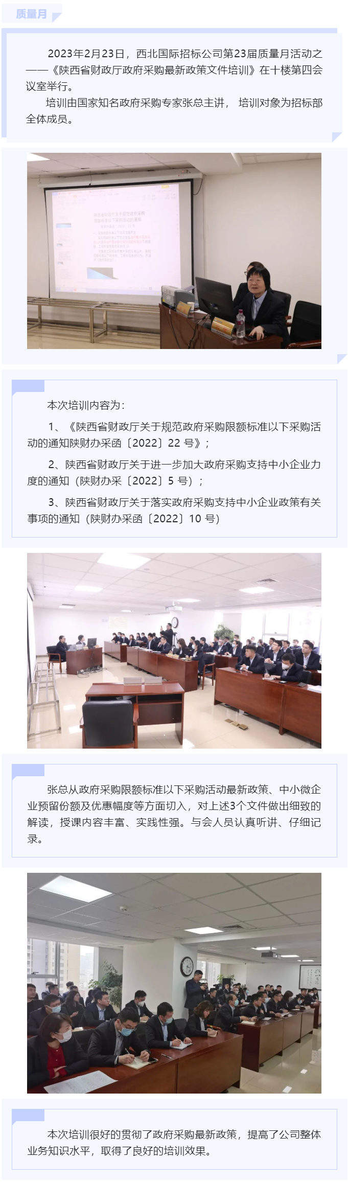 西北國際招標公司第23屆質(zhì)量月活動之——《陜西省財政廳政府采購最新政策文件培訓(xùn)》