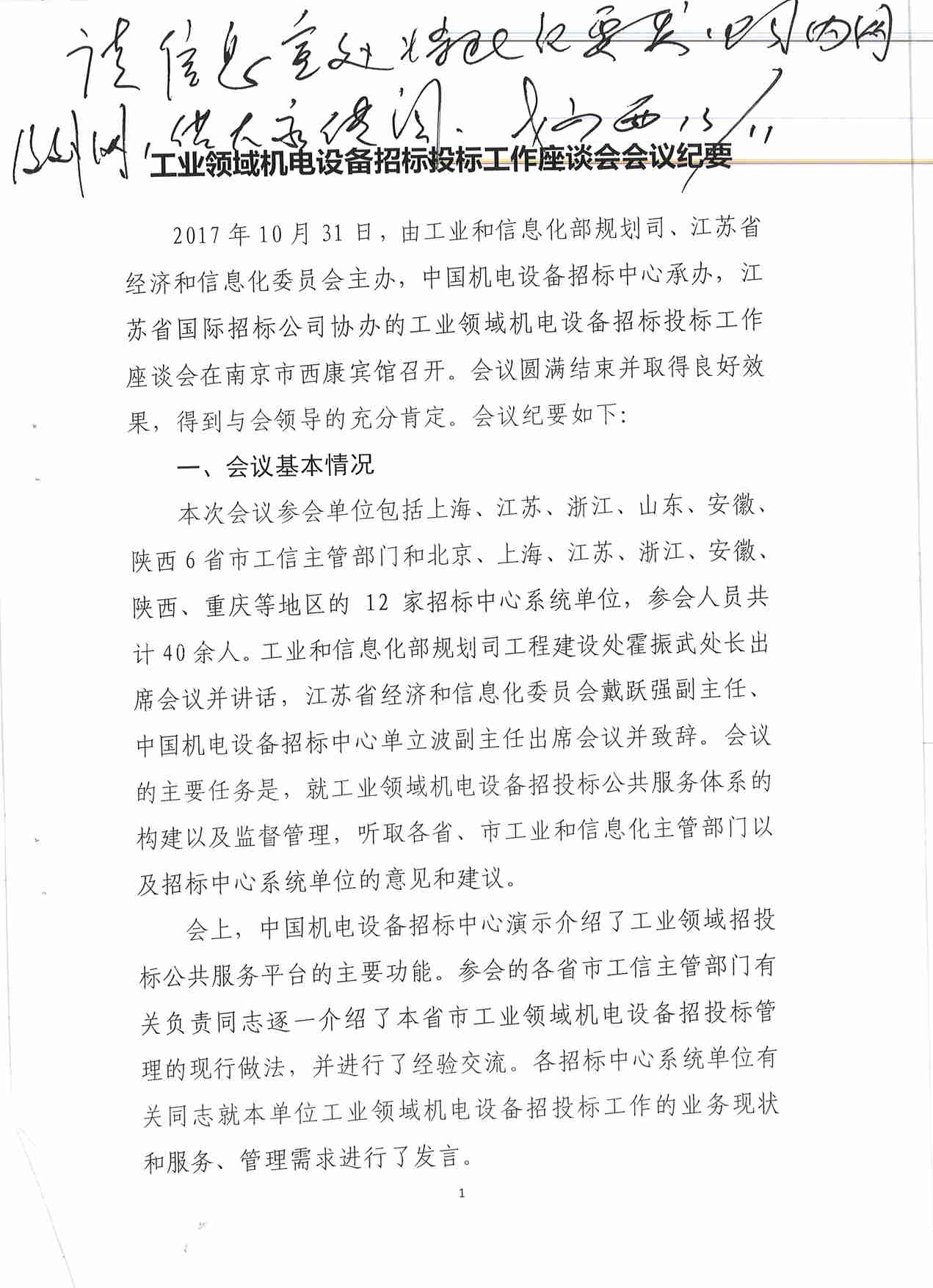 由工信部規(guī)劃司主辦,在南京召開(2017年10月31日)的 “工業(yè)領(lǐng)域機電設(shè)備招投投標工作座談會”《會議紀要》現(xiàn)已下發(fā)。全國6省市工信主管部門和12家招標代理機構(gòu)參加此次座談會,我公司董事長總經(jīng)理戈乃西受邀參加會議。