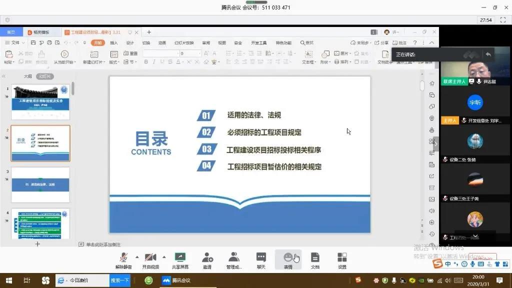 3月31日20時整,由尹總主講的“工程建設(shè)項目招標法規(guī)及實務(wù)”遠程視頻培訓會議開講了。