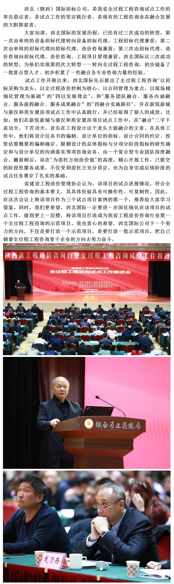 我公司在工程造價咨詢行業(yè)全過程工程咨詢試點工作推進會上獲陜西省建設(shè)工程造價咨詢協(xié)會會長彭吉新高度贊揚