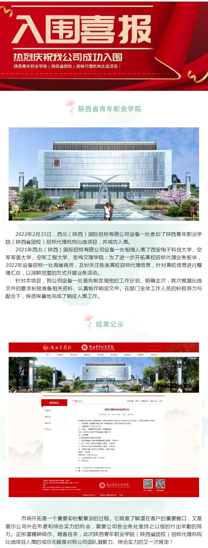 西北(陜西)國際招標(biāo)有限公司成功入圍陜西青年職業(yè)學(xué)院(陜西省團(tuán)校)招標(biāo)代理機(jī)構(gòu)比選項(xiàng)目