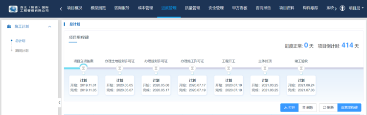 目前BIM中心已安排有序駐場。駐場后初步搭建了5D平臺,創(chuàng)建網(wǎng)頁端、項目云空間。目前已經(jīng)將網(wǎng)頁端權(quán)限開放至相關(guān)領(lǐng)導(dǎo)及部分業(yè)主代表,項目初期充分吸收各方意見,嘗試探索工作的深度廣度。通過和廣聯(lián)達(dá)公司深入溝通,成功在網(wǎng)頁端添加施工總計劃、設(shè)置項目里程碑,使得項目計劃與重要時間節(jié)點一目了然。