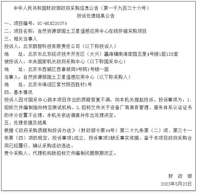 5月30日,財(cái)政部發(fā)布1936號(hào)政府采購處理意見,涉及項(xiàng)目為自然資源部國土衛(wèi)星遙感應(yīng)用在線存儲(chǔ)采購項(xiàng)目,預(yù)算 500 萬元。